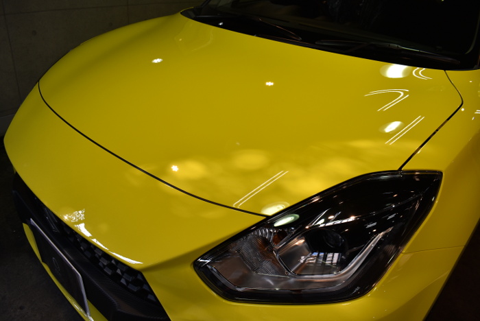 今回、こちらのお車は新車でご入庫いただきました。最初の洗車を終え、まずボディー全体を高輝度LEDで照らしボディー全体の状態を確認します。新車といえど所々傷が見受けられます。そして、季節的な花粉のダメージも受け始めている印象でした。下地処理で傷を除去していくのはもちろん、花粉のダメージも除去していきます。下地処理を終えると、うっすらと入っていた傷やポツポツと付着した花粉のダメージが解消され、塗装の状態は新車以上になりました。