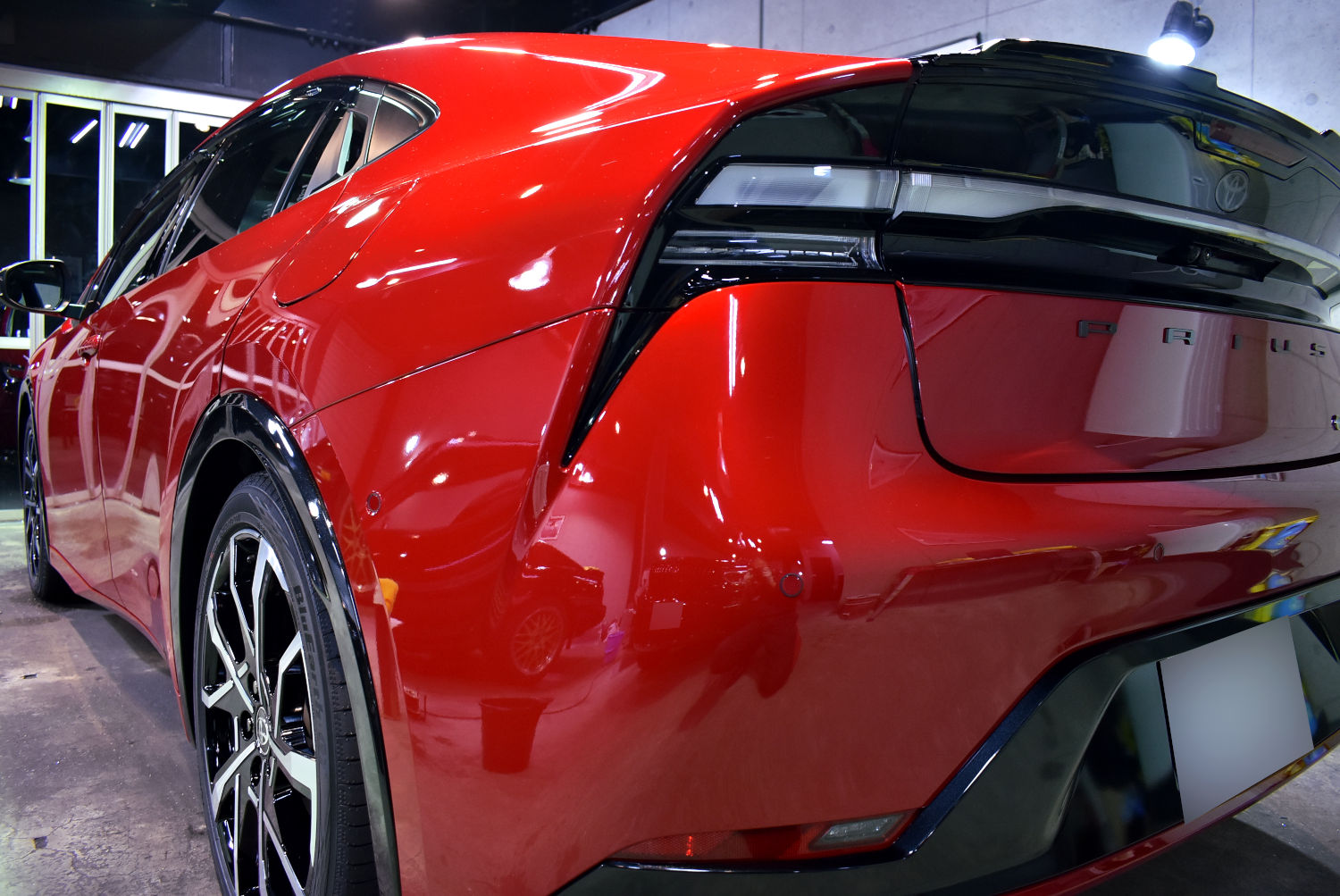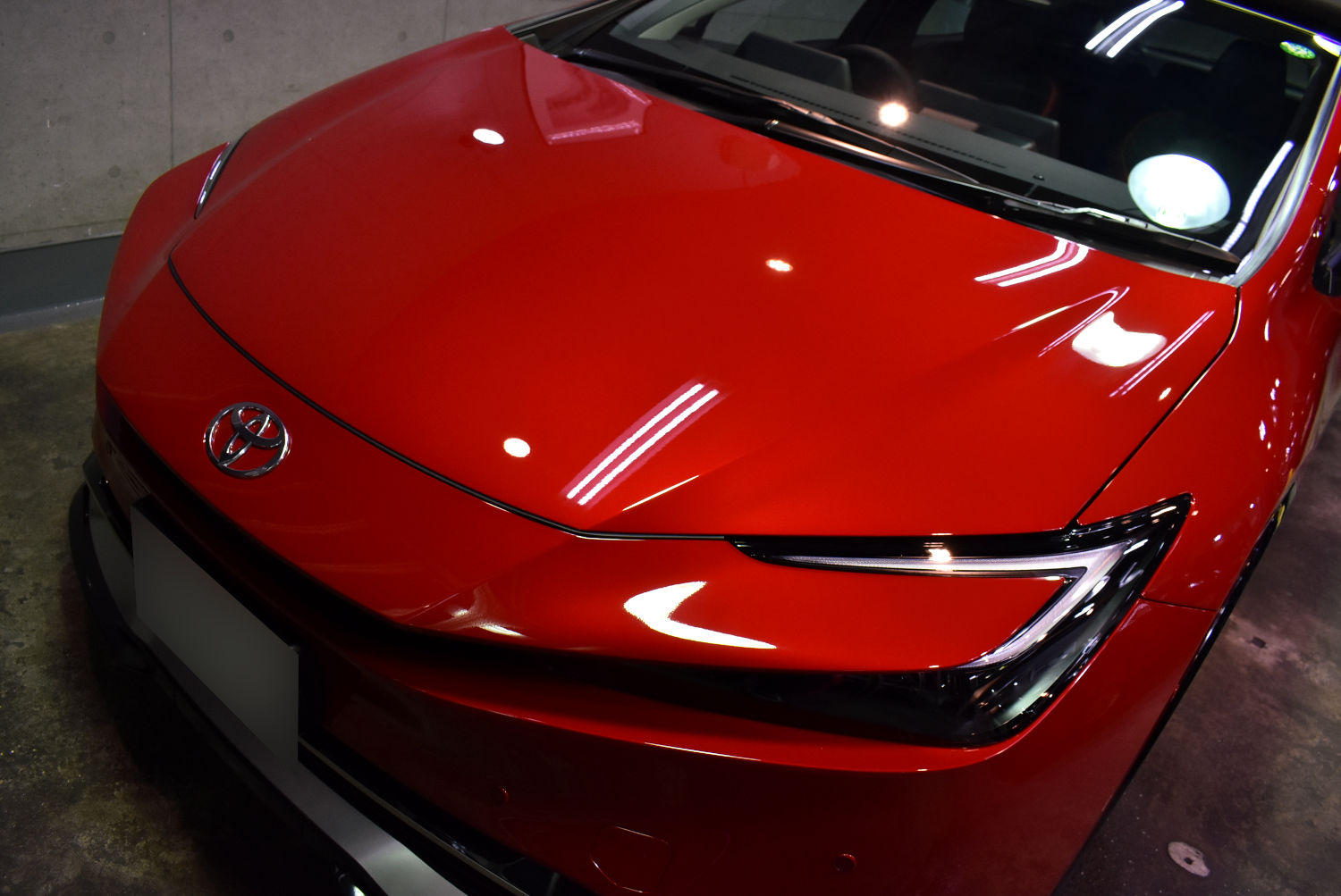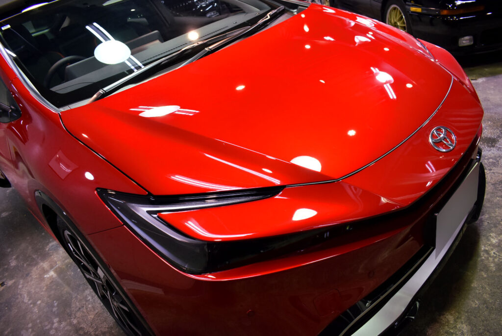 今回お預かりしたこちらの一台は、納車間もない新車状態でご入庫いただきました。トヨタの塗装は非常に優秀ですが、多少の塗装ボケは見受けられました。更に言えば、新車と言えども何回か洗車をされているわけで、その間についたちょっとしたシミや小傷も散見されました。