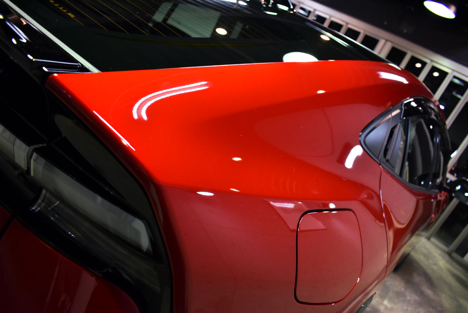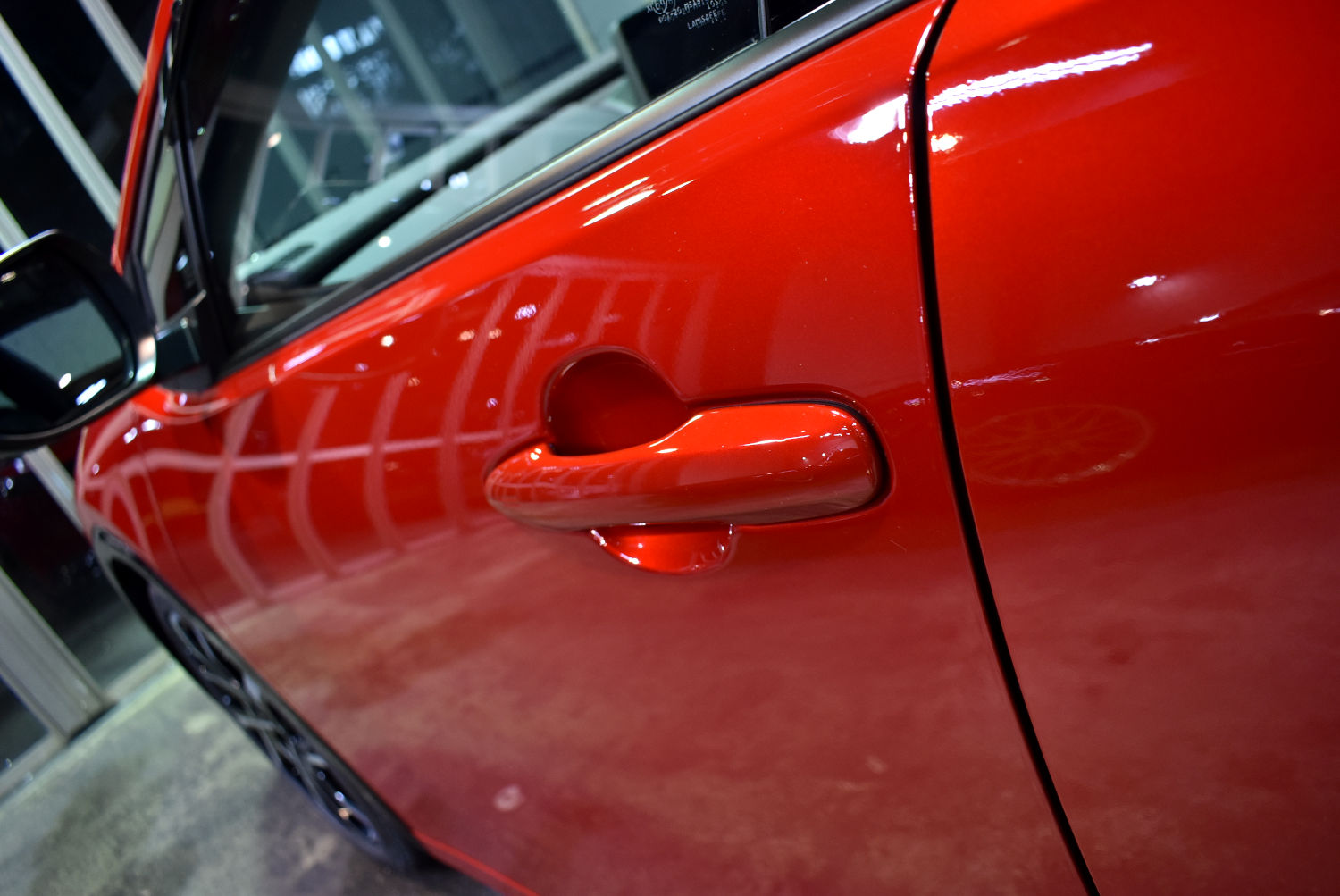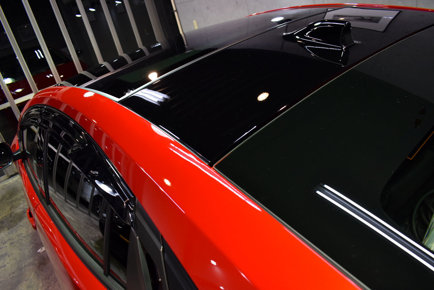 ということで、こちらのお車ももちろん下地処理を施すことから作業を進めさせていただきました。塗装ダメージをきっちり処理しつつ、塗装面に対する負担の少ない【Revolt Adjust System】という技法で優しく丁寧に磨きあげ、塗装ボケを解消し、小傷や水シミ等の塗装ダメージを一掃して新車以上の美しい塗装面に整えました。
