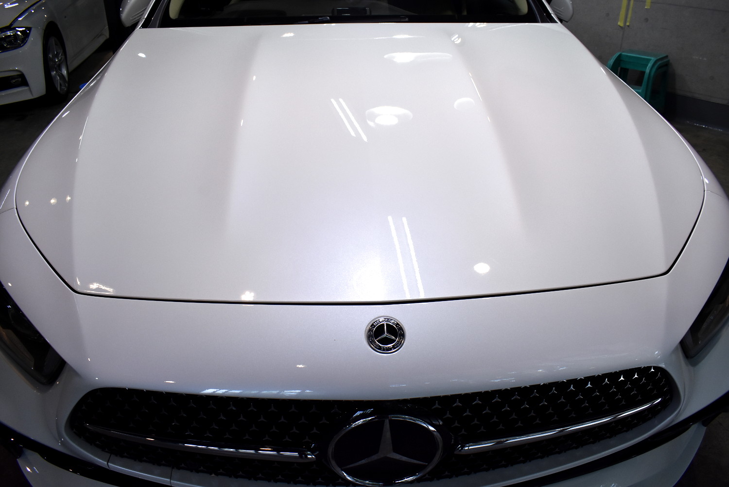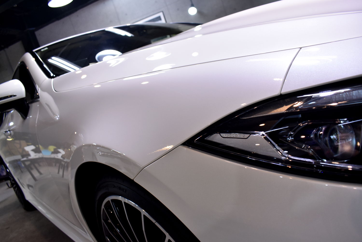 さて、今回中古でご購入されたお車を、納車後すぐにお持ち込みいただきました。ボディの状態はそこそこ良い状態に整備されていたようですが、ダメージやシミ等散見されましたので、まずは本来の美しいホワイトの輝きを取り戻すべく、下地処理を進めます。