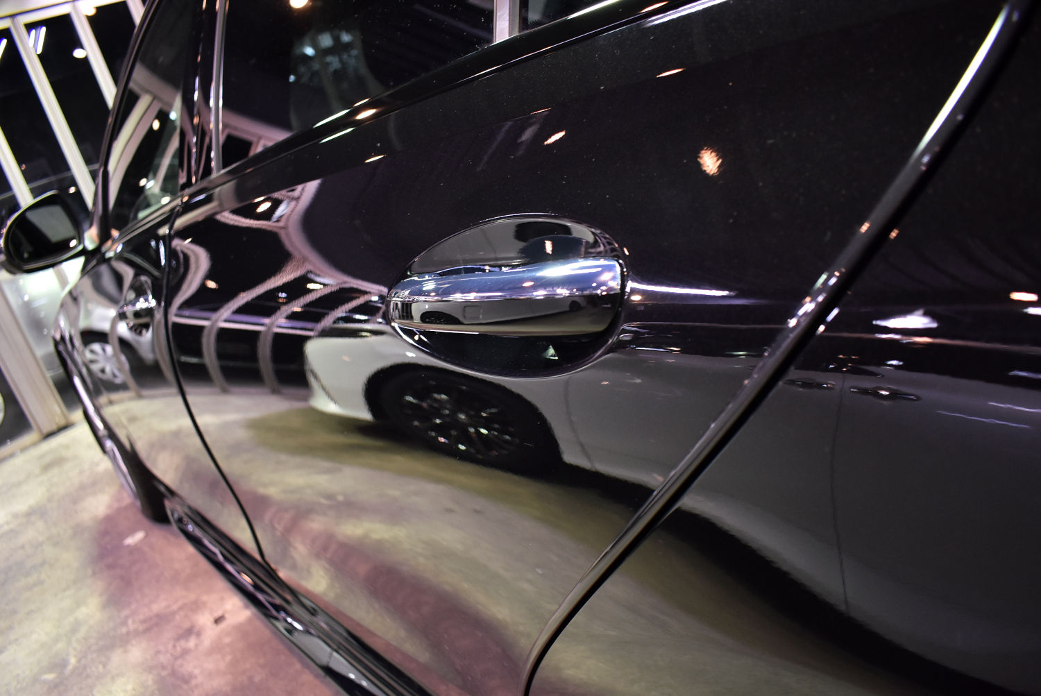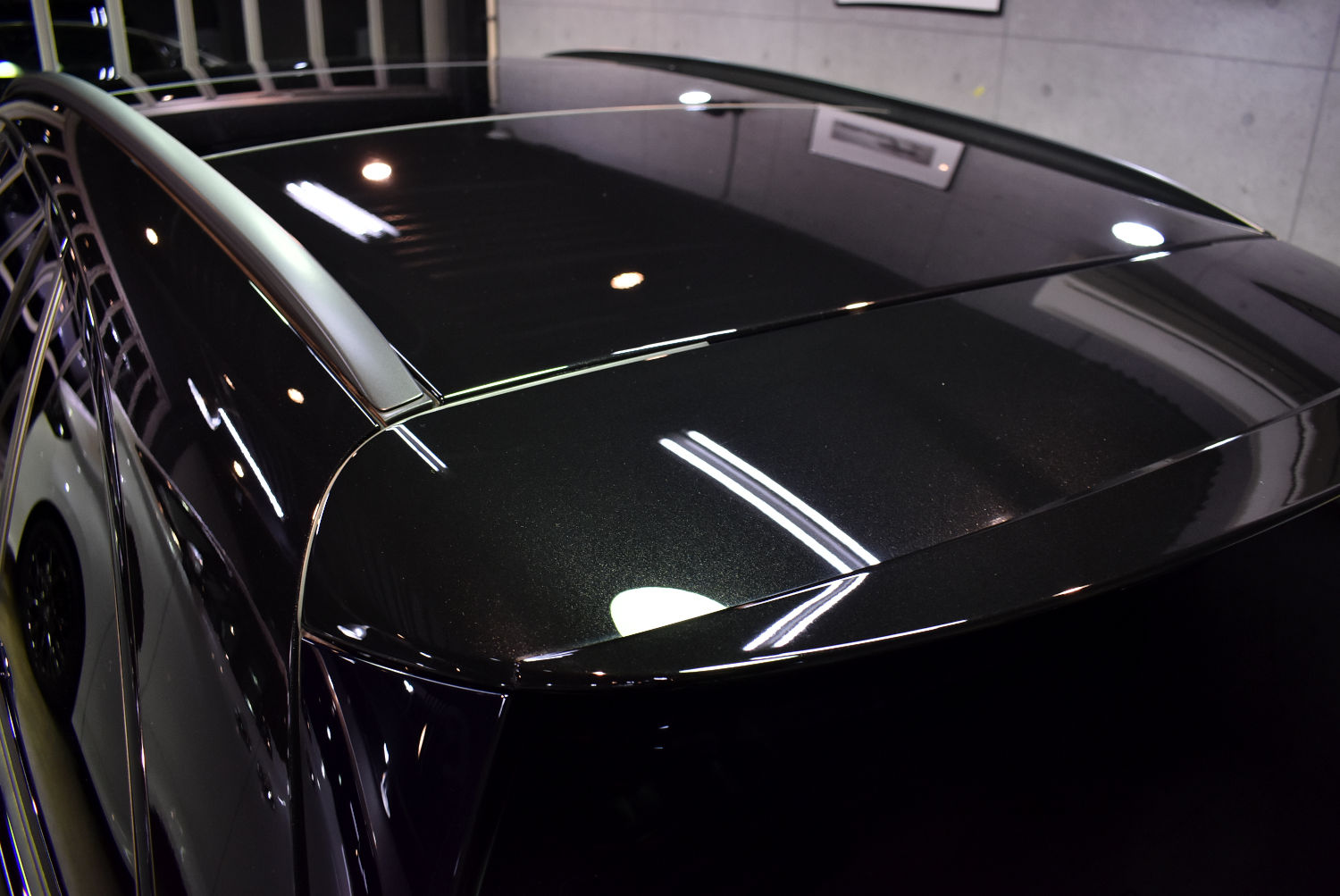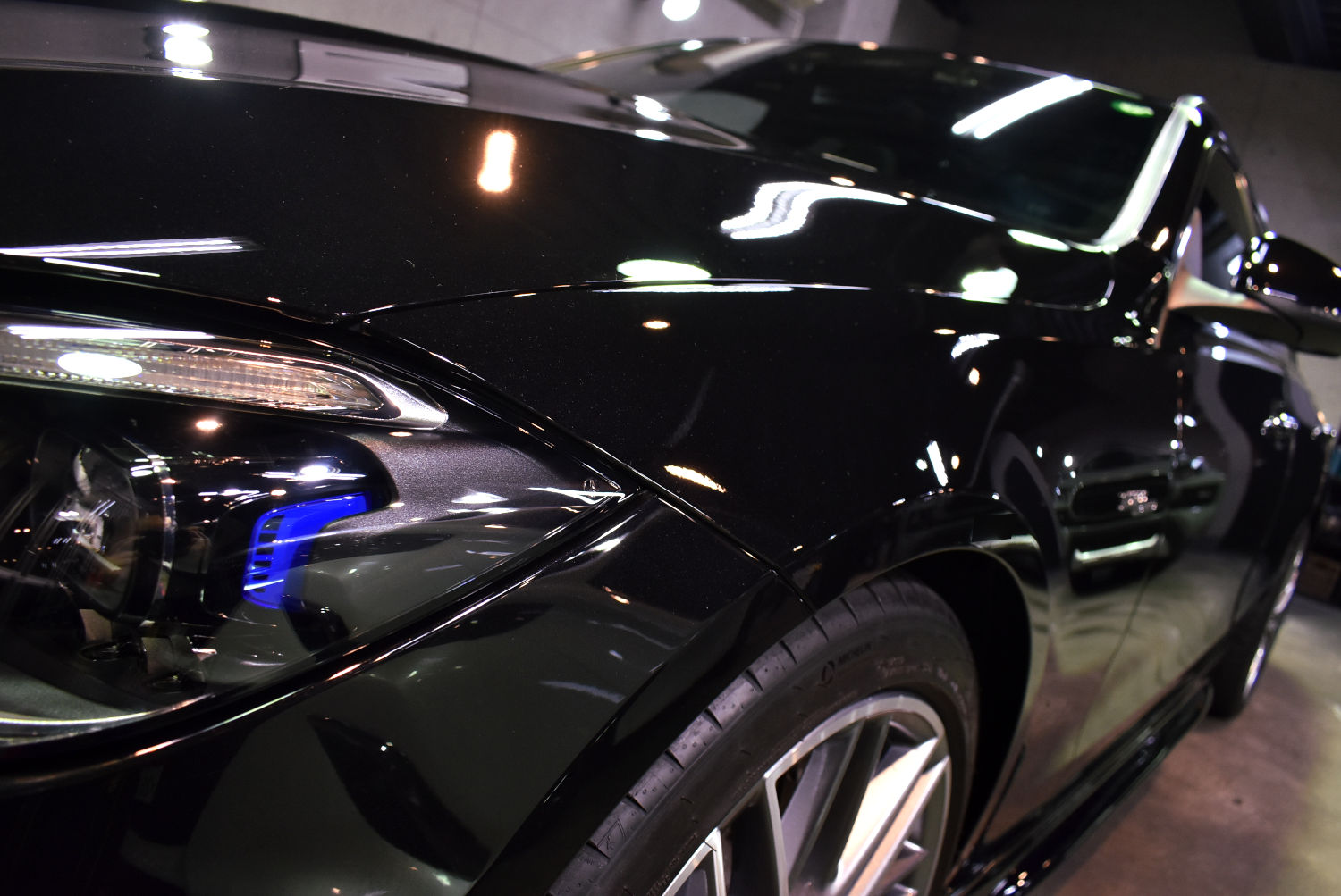 さて、今回お預かりしたこちらのお車は1年程度経過した経年車です。傷シミが目立つといった劣化はなく比較的良い状態ではありましたが、黒というボディカラーは他のカラーよりもダメージが見えてしまう厄介な色でもあります。当店の照明下に置くと、洗車時にできるスクラッチ、雨ジミが浮き上がってきます。美観を損なうこれらの要因を下地処理(ボディ磨き)によって解消するのが第一ステップとなります。