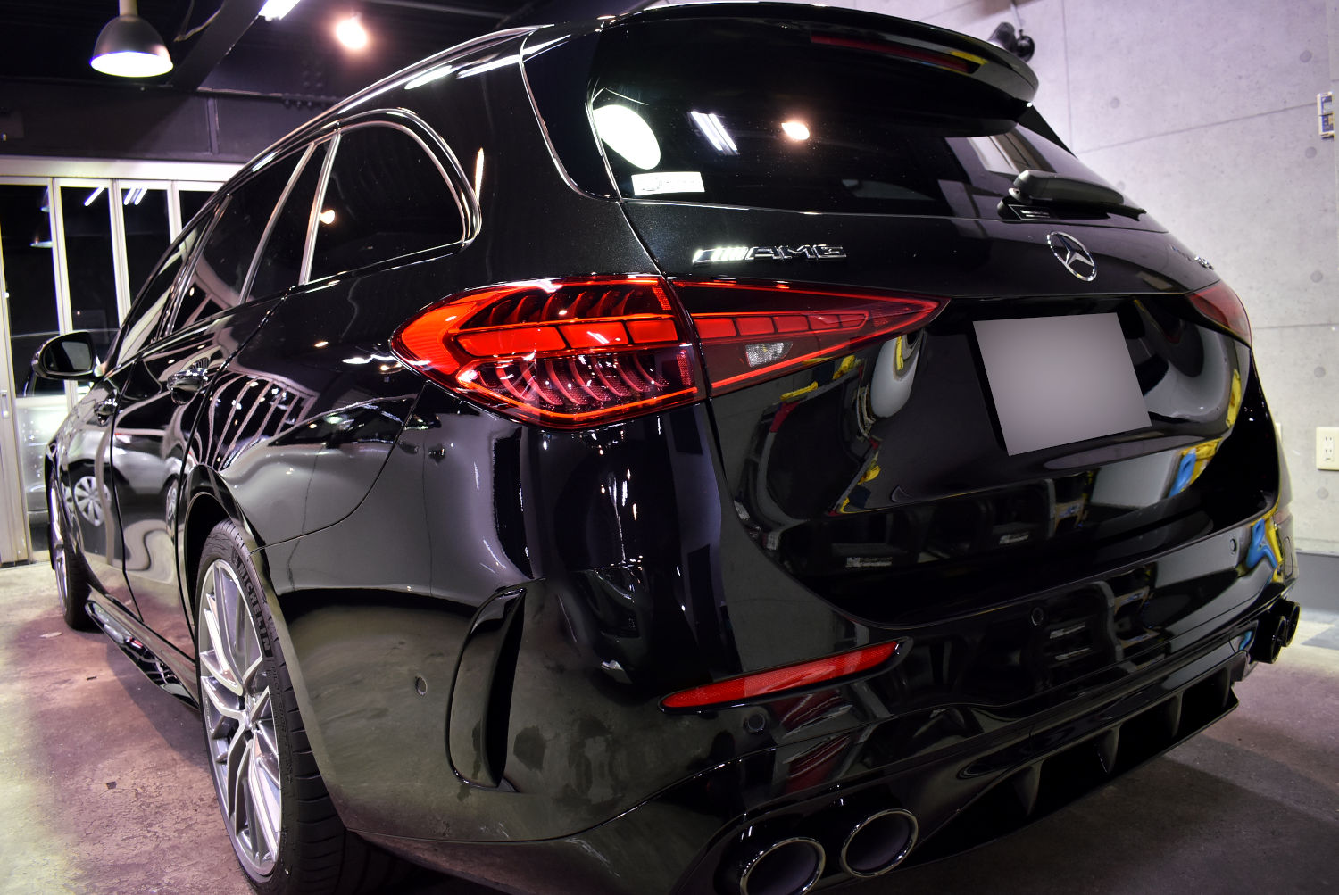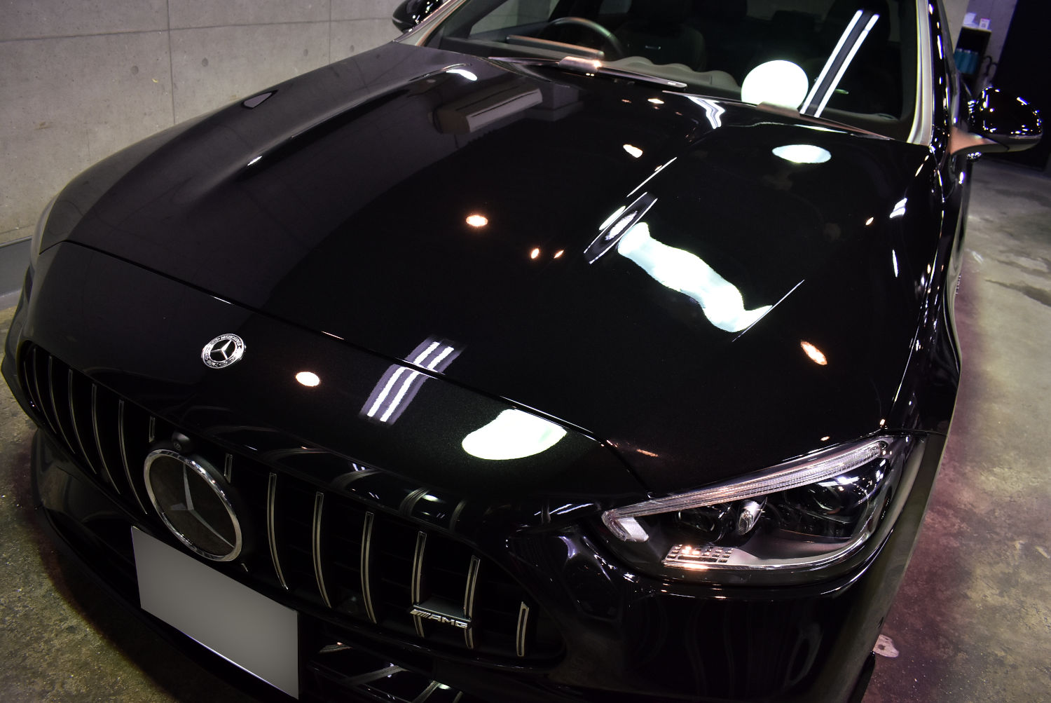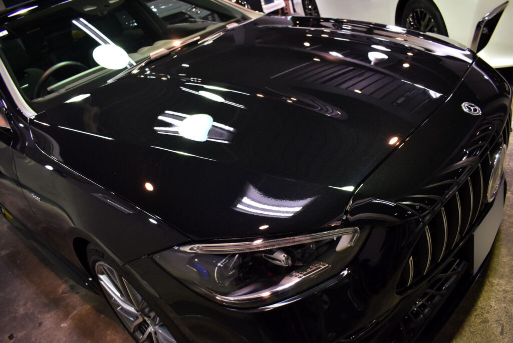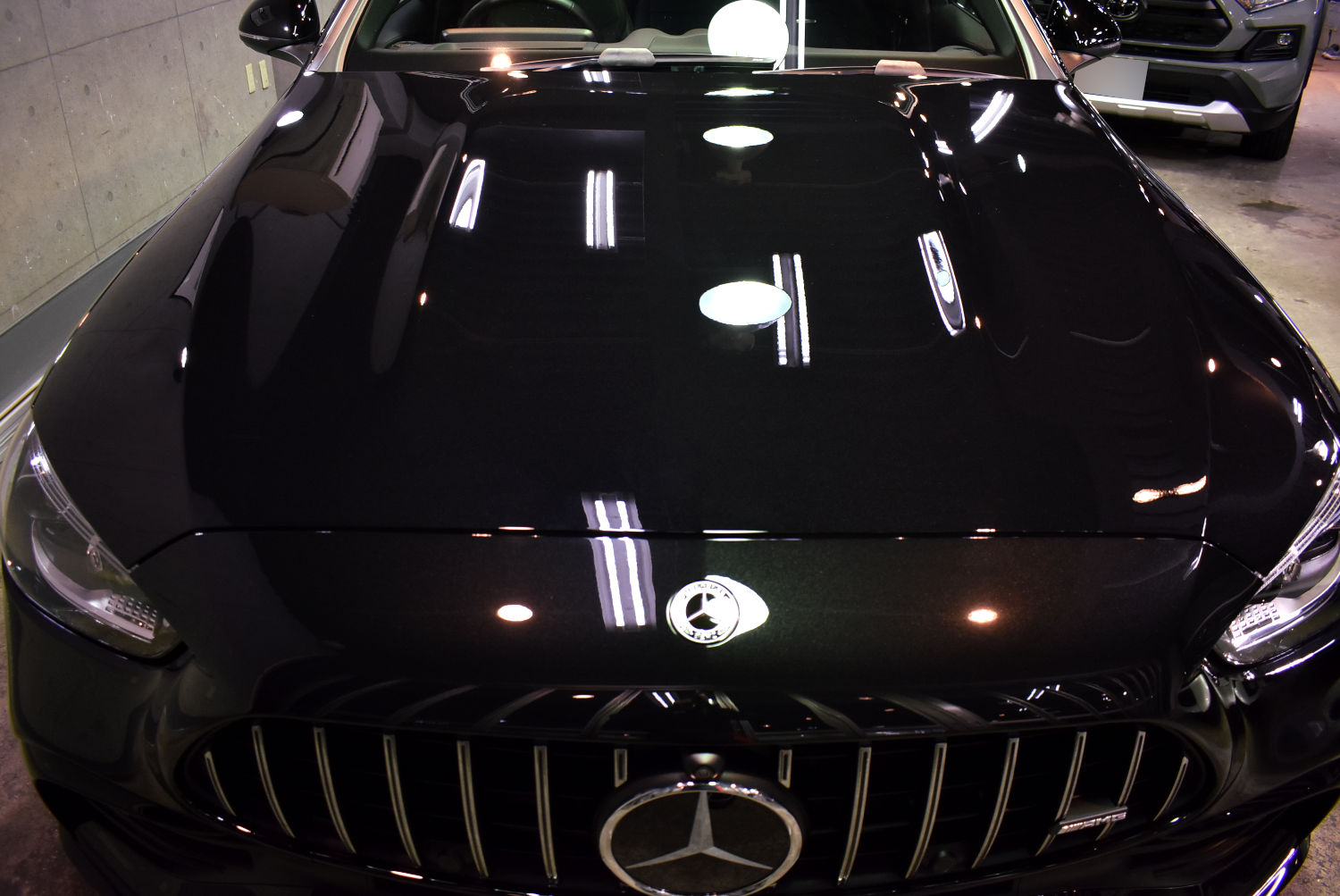 さて、今回お預かりしたこちらのお車は1年程度経過した経年車です。傷シミが目立つといった劣化はなく比較的良い状態ではありましたが、黒というボディカラーは他のカラーよりもダメージが見えてしまう厄介な色でもあります。当店の照明下に置くと、洗車時にできるスクラッチ、雨ジミが浮き上がってきます。美観を損なうこれらの要因を下地処理(ボディ磨き)によって解消するのが第一ステップとなります。