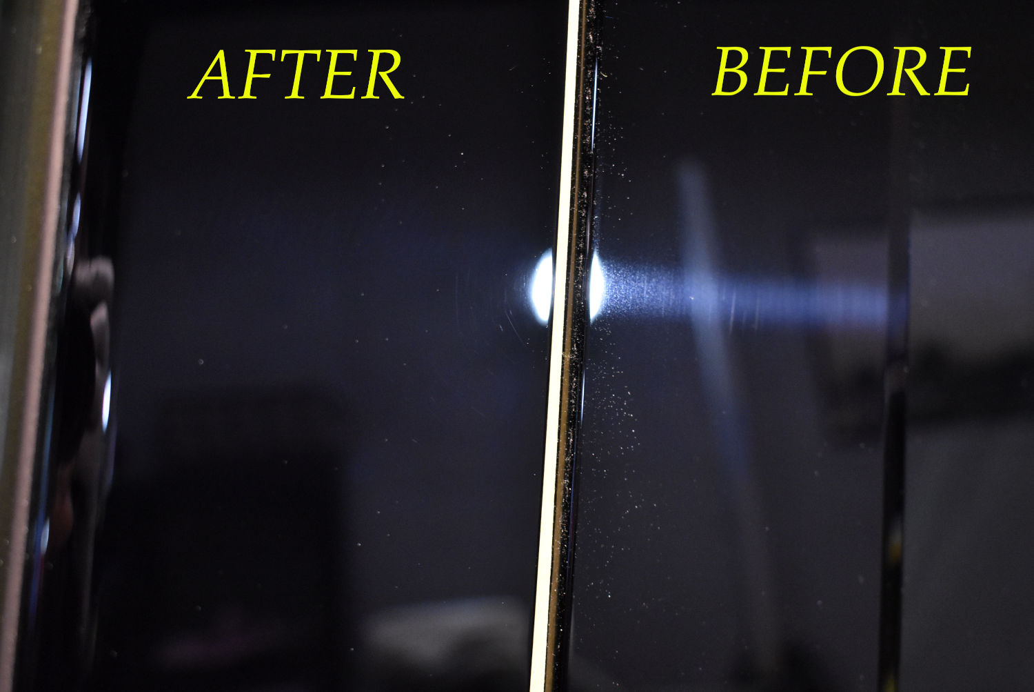 センターピラーの筋状の傷もかなりの部分で綺麗に落とせましたし、塗装面の輝度も1ランクアップしました。